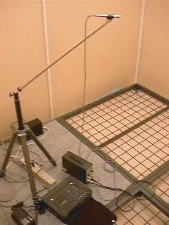 自然楽器と、それを演奏する人を用意する。無響箱内で、マイクロホン(B&K4190)をプリアンプ(B&K2669)に接続し、プリアンプ出力をマイクロホン電源(B&K5953)の入力に接続する。マイクロホン電源の出力は、DAT(TASCAM DA-P1)のLine In(L, R どちらでもよい)端子に接続する。マイクロホンをスタンドに固定し、演奏者がもつ楽器から約50cmほど離れた位置におく。このとき、楽器、演奏者、マイクロホンの3者の位置と向き(角度)、距離の関係を見取り図として記録しておき、その図をレポートに書くこと。また、以下に説明する録音機器の接続の見取図(何という機器のどの端子になにを接続したかが分かる図)もレポートに書くこと。