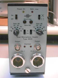 先端にマイクロホン(B&K4190)を取り付けて、収音を行う。プリアンプの出力は、マイクロホン電源に入力する。